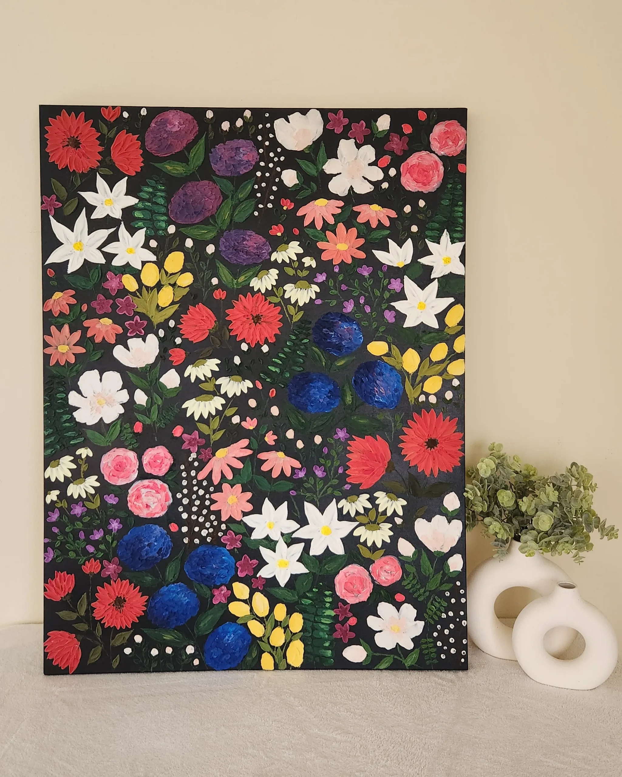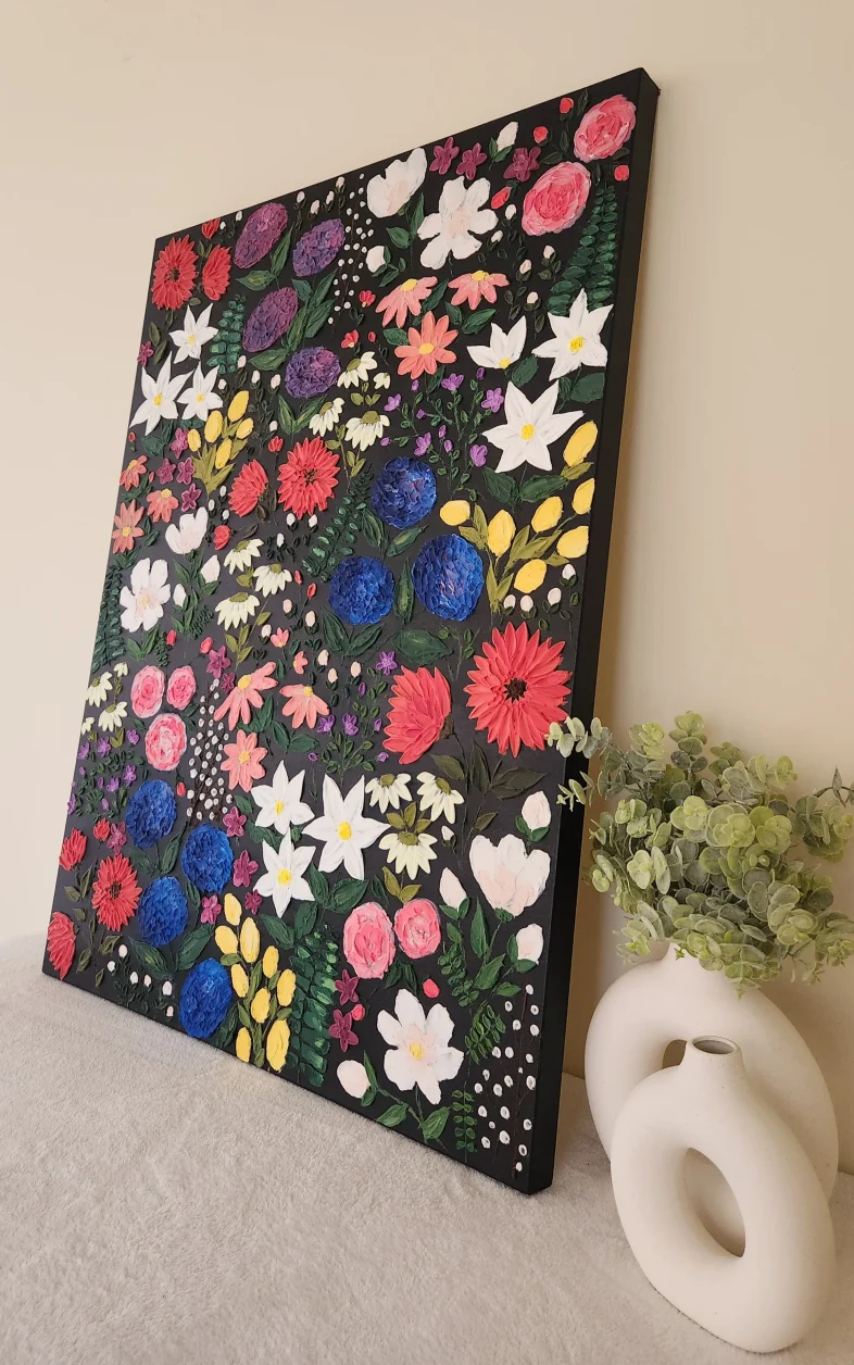 a talented artist whose primary medium is texture art. She meticulously crafts each petal or string with a palette knife, infusing her works with intricate detail and depth. Insiya’s paintings draw inspiration from the natural world, with color combinations reminiscent of vibrant flower gardens and the intricate patterns of microbiology. Her personality is a delightful blend of fun and loveliness, finding solace and expression in her art. Insiya’s unique approach and nature-inspired creations captivate and inspire all who view her work.